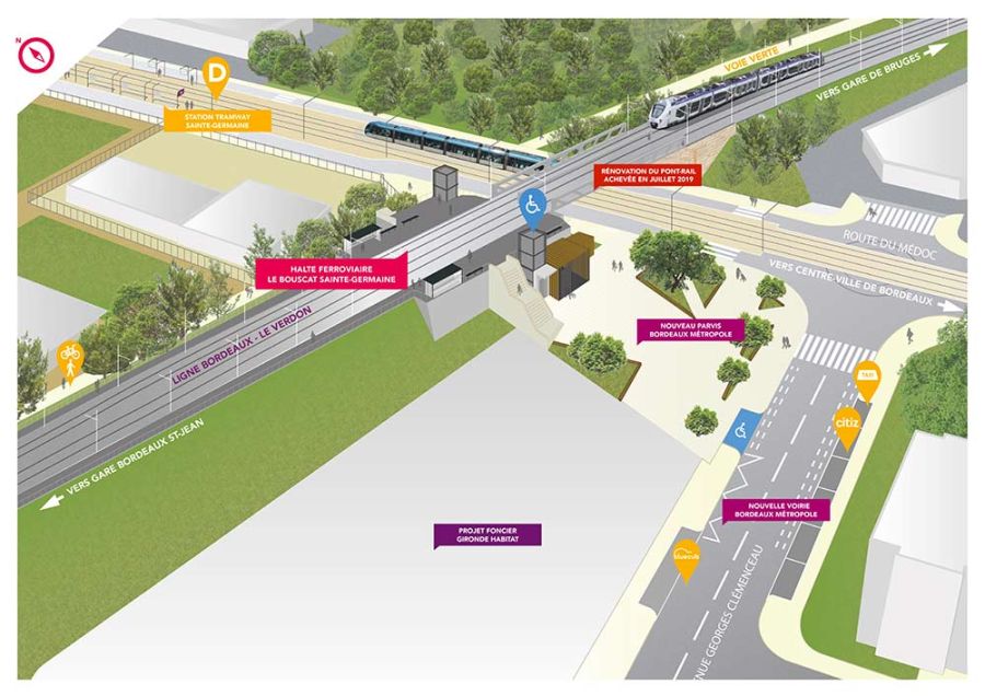 Pour améliorer la desserte en TER, les haltes du Bouscat-Sainte-Germaine et de Talence-Médoquine sont créées et la mise en place de pôles d’échanges multimodaux favorise l’intermodalité.