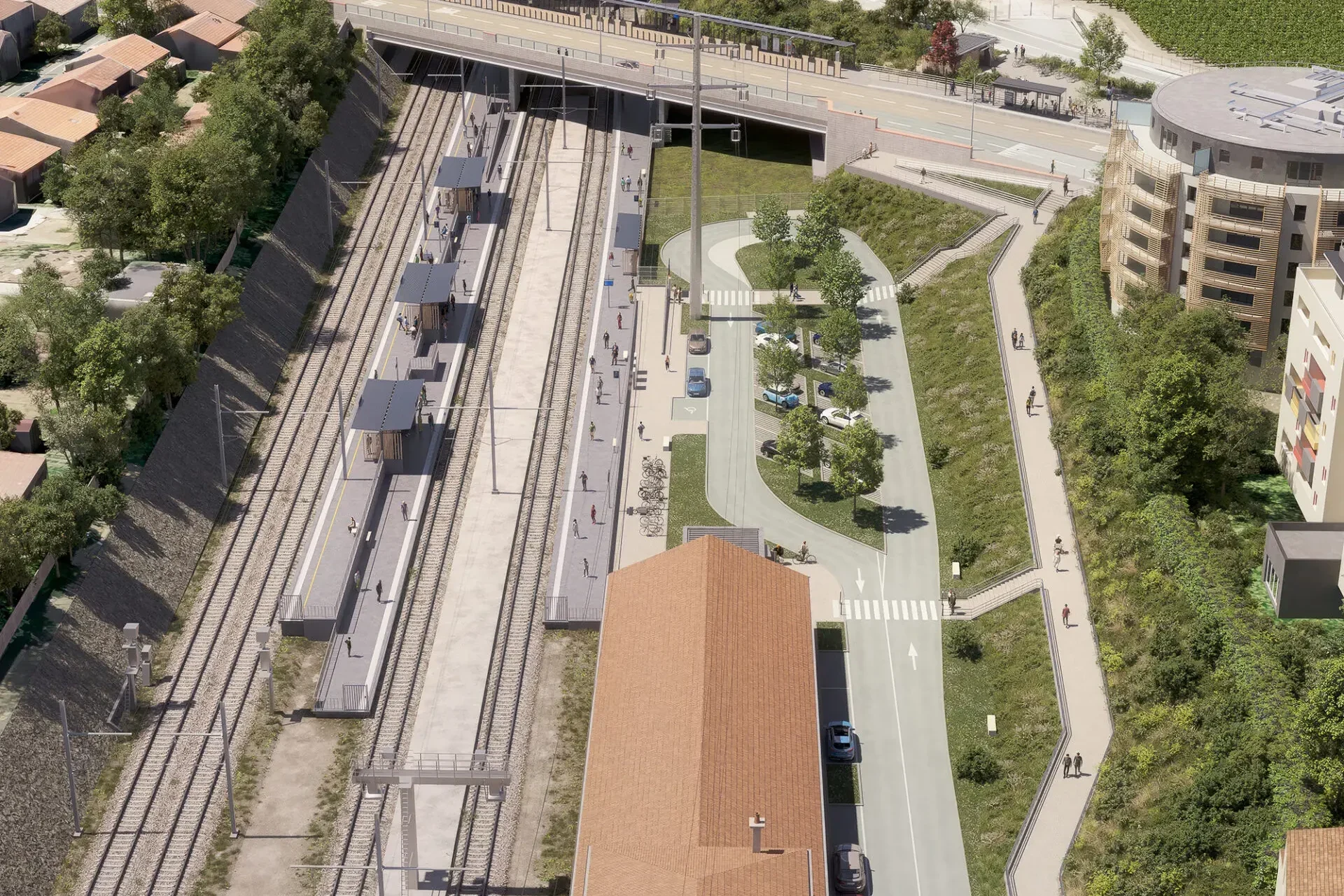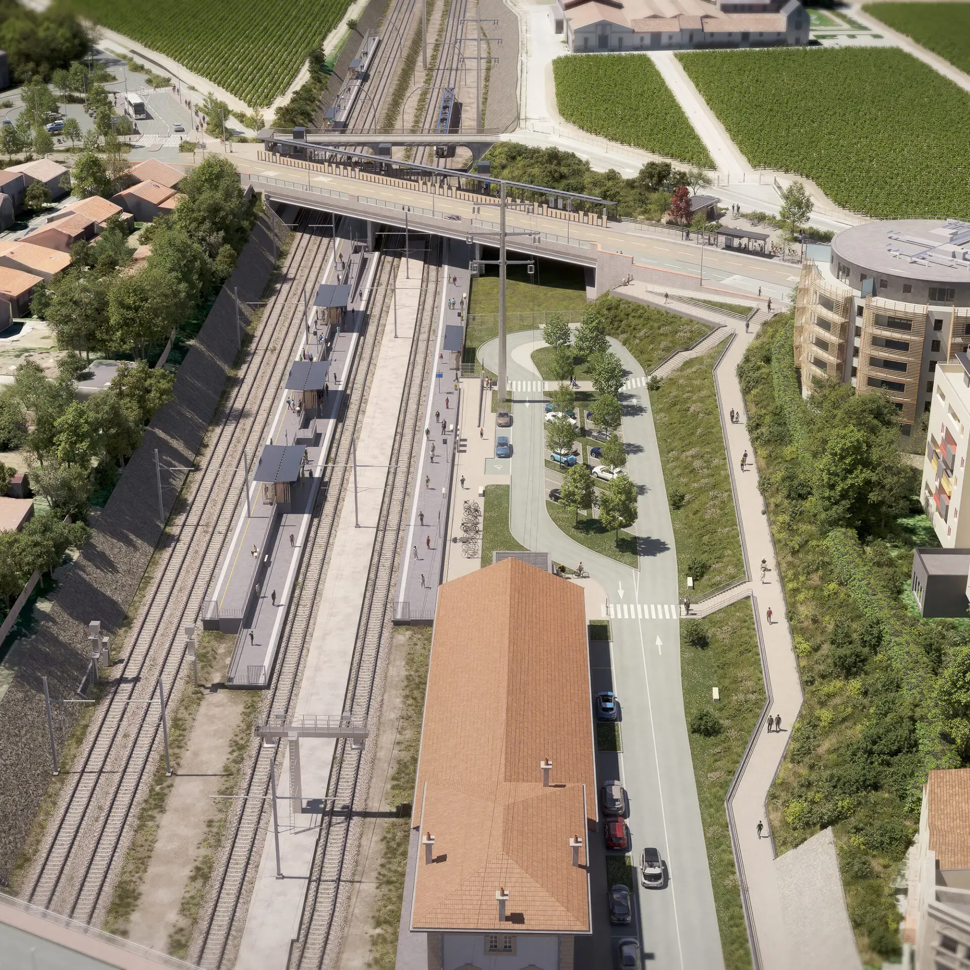 AMÉNAGEMENT DU PÔLE D’ÉCHANGES MULTIMODALCréation d’une offre multimodale autour de la halte : abris vélos sécurisés, arrêts de bus et de car express, places de stationnement, places de dépose minute, accès piéton facilité.